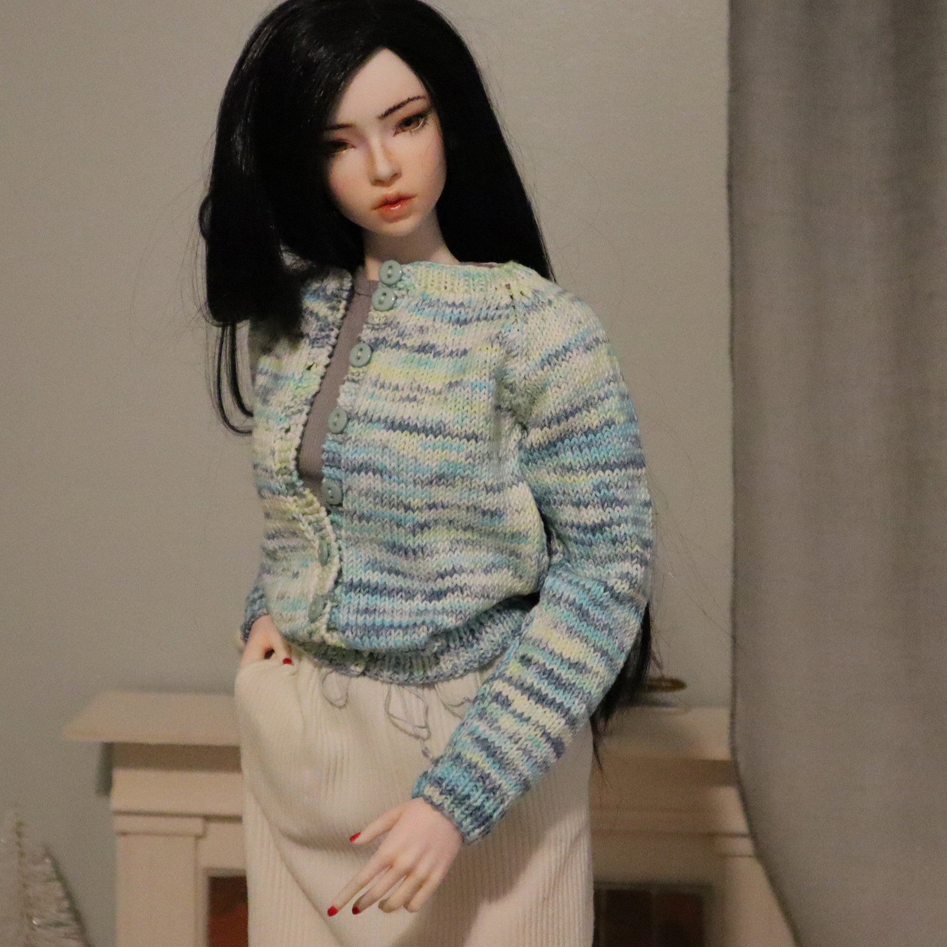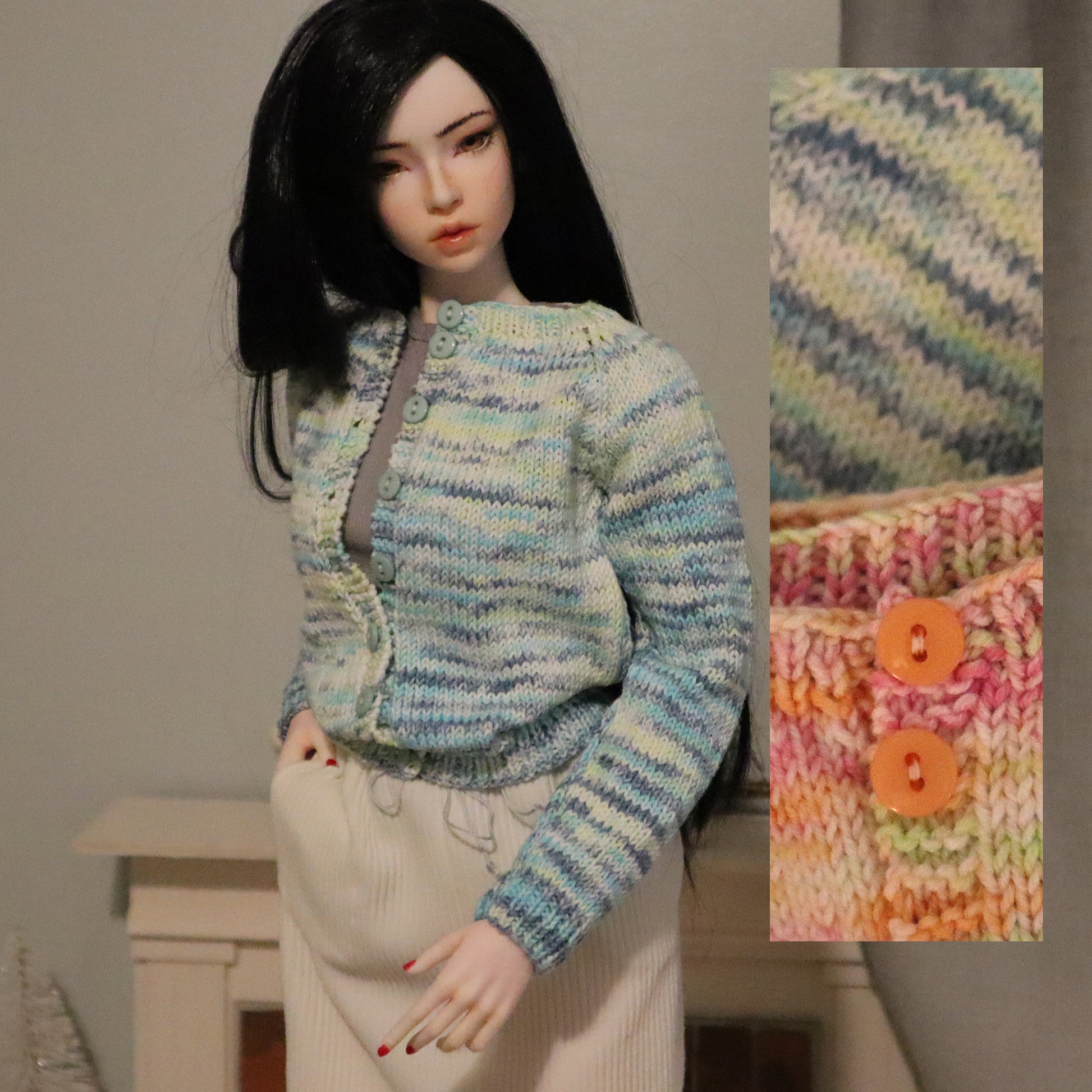 Shown on my 63cm Impldoll, sleeves and body make a classic cardigan fit. Will be a looser, longer fit on 60cm dolls like Smart doll Classic, and Pear (will also fit Smartdoll Guys)