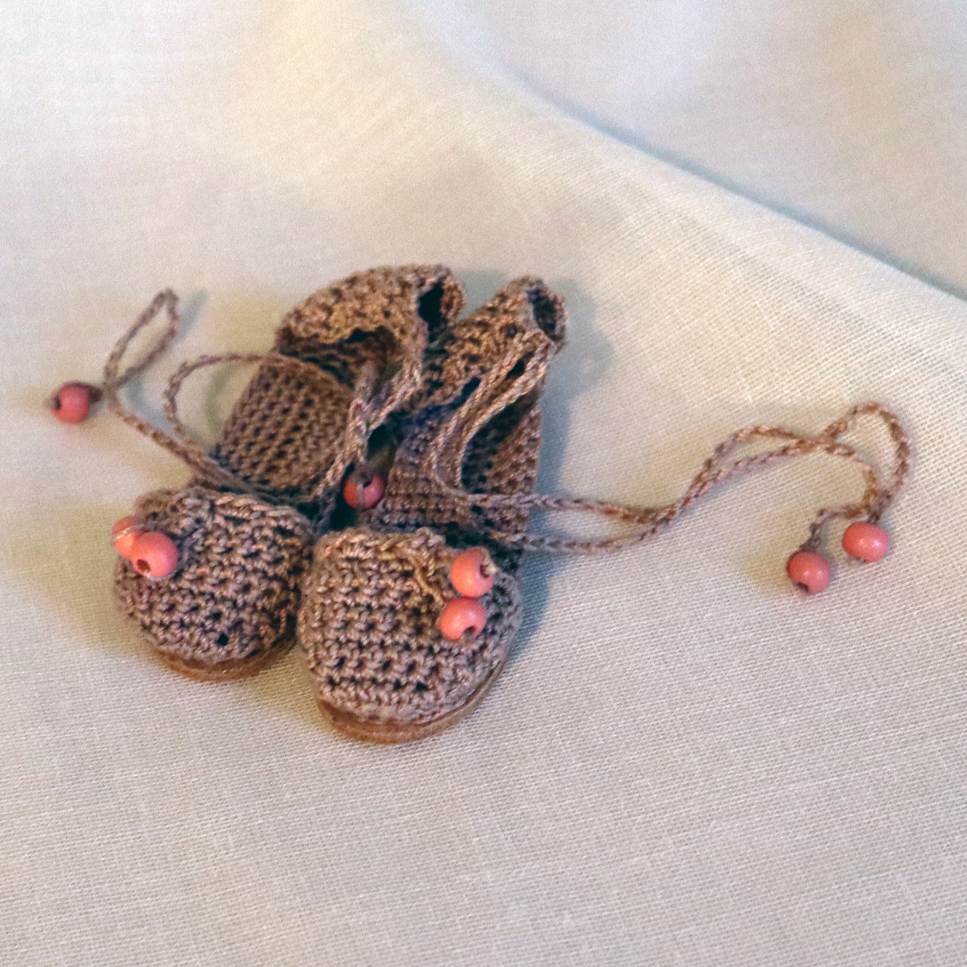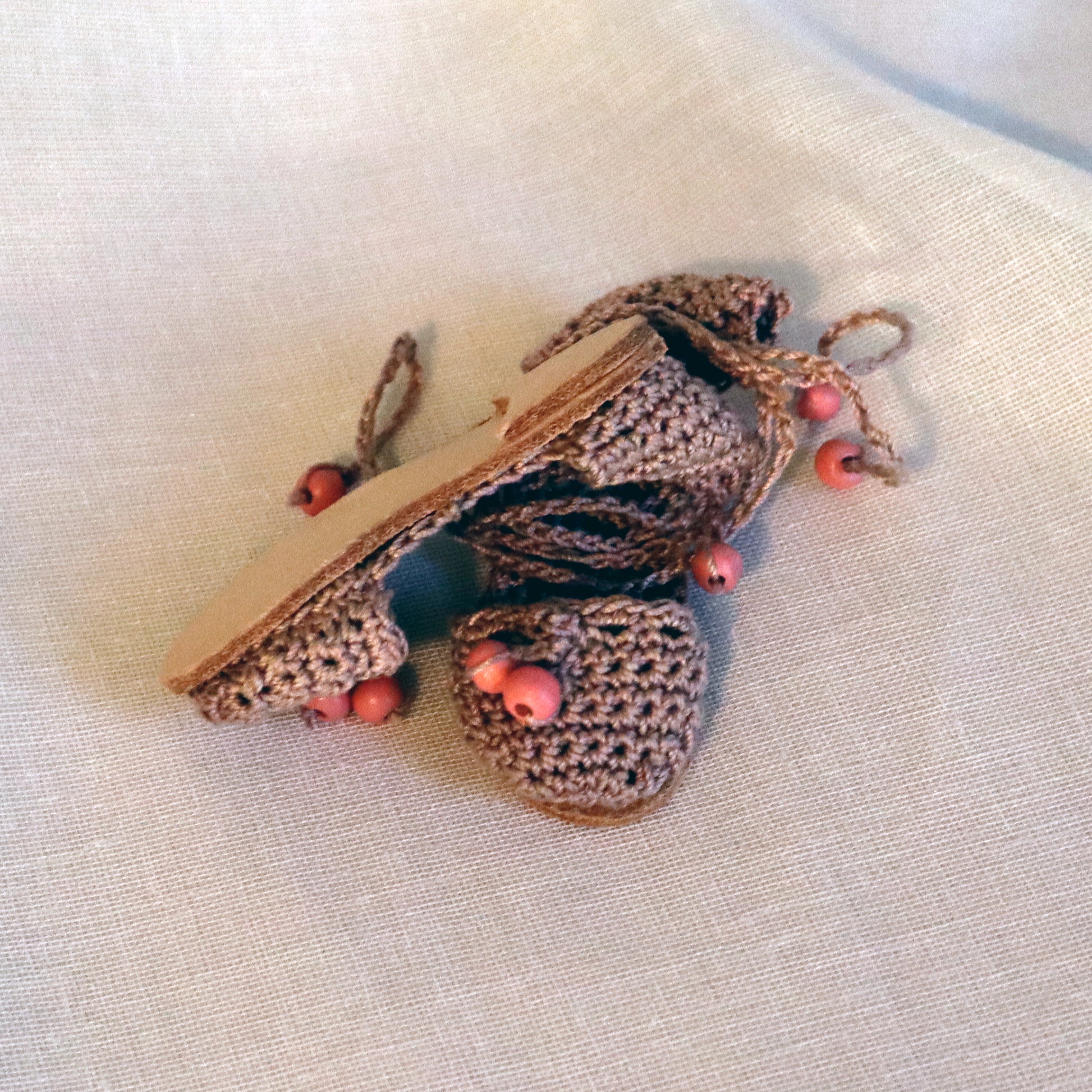 A very quick make, especially if you have ever crocheted doilies or other small projects. US crochet terms. Some scraps of thread, a few seed beads, a bit of leather or craft foam and a hour to so to make a cute pair of Summer sandals for your dolls. Made to fit Smartdoll feet, FINISHED SIZE IS 6.5CM LONG BY 2.5CM WIDE.