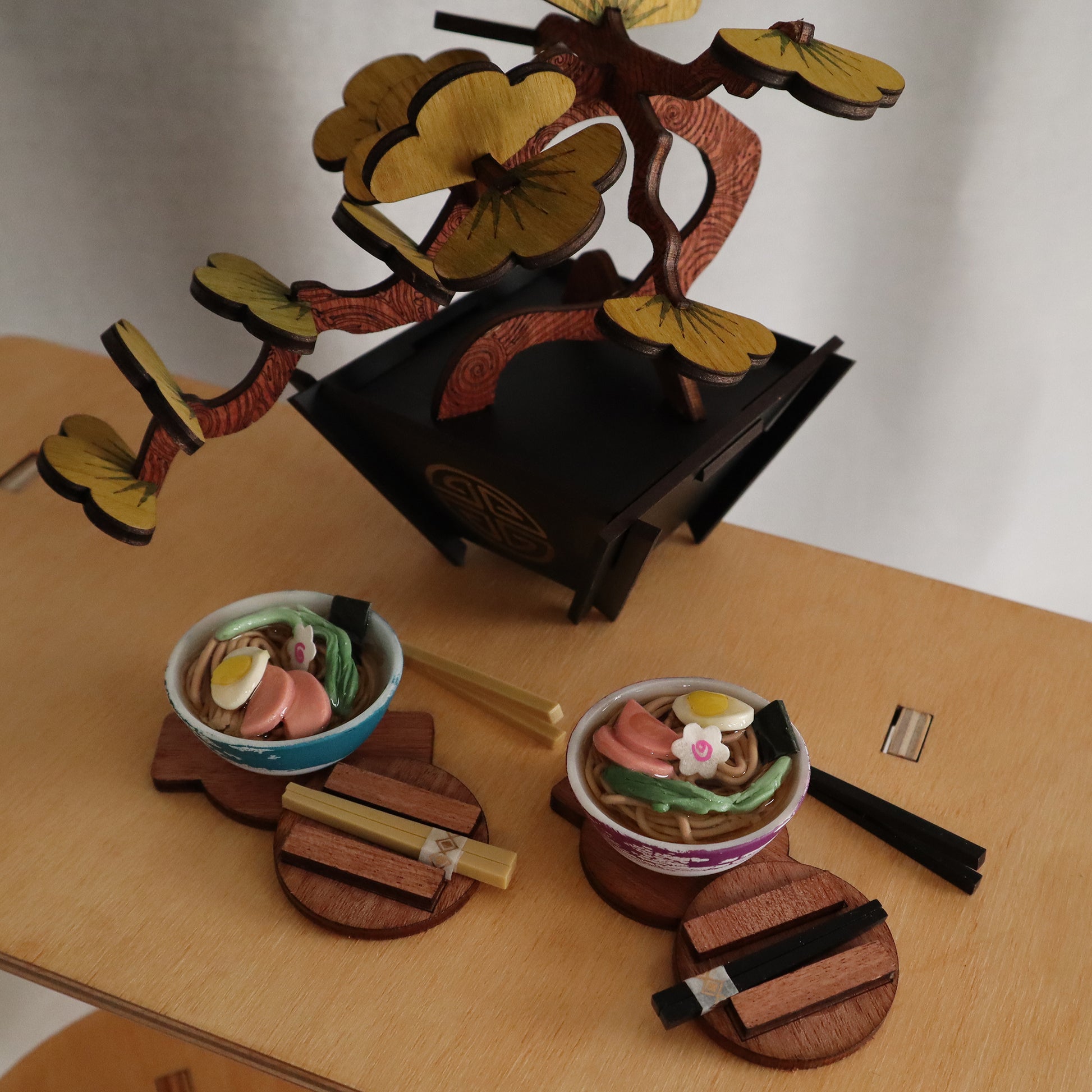 Scaled to work with either 1/4 scale bjds and vinyl dolls. Set includes bowl filled with noodles, broth and garnishes. Bowl sits on a wooden trivet and includes a wooden lid. 2 sets of chopsticks are included. One regular separated set (held with washi tape) for display and a second joined set that allows the doll to "hold them".