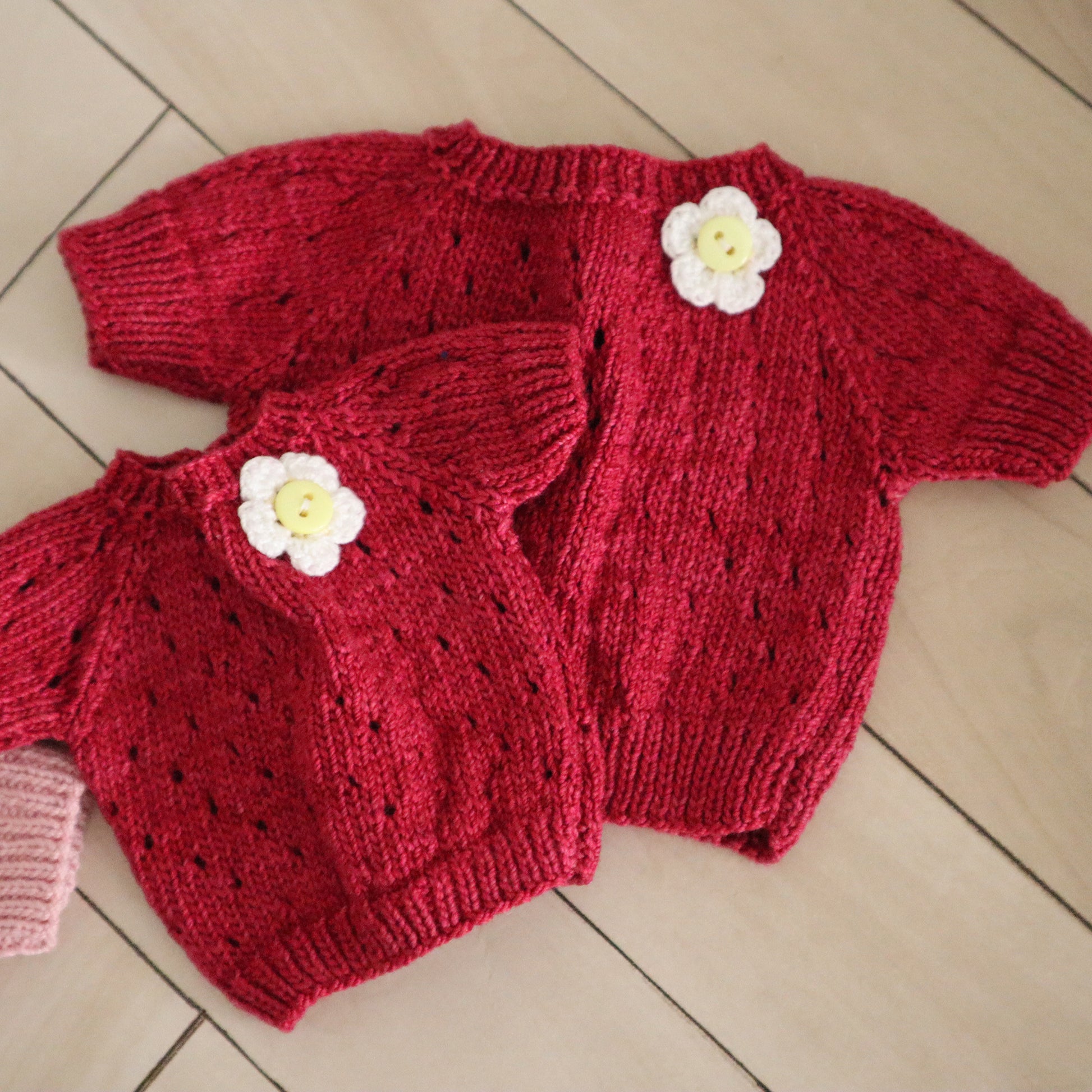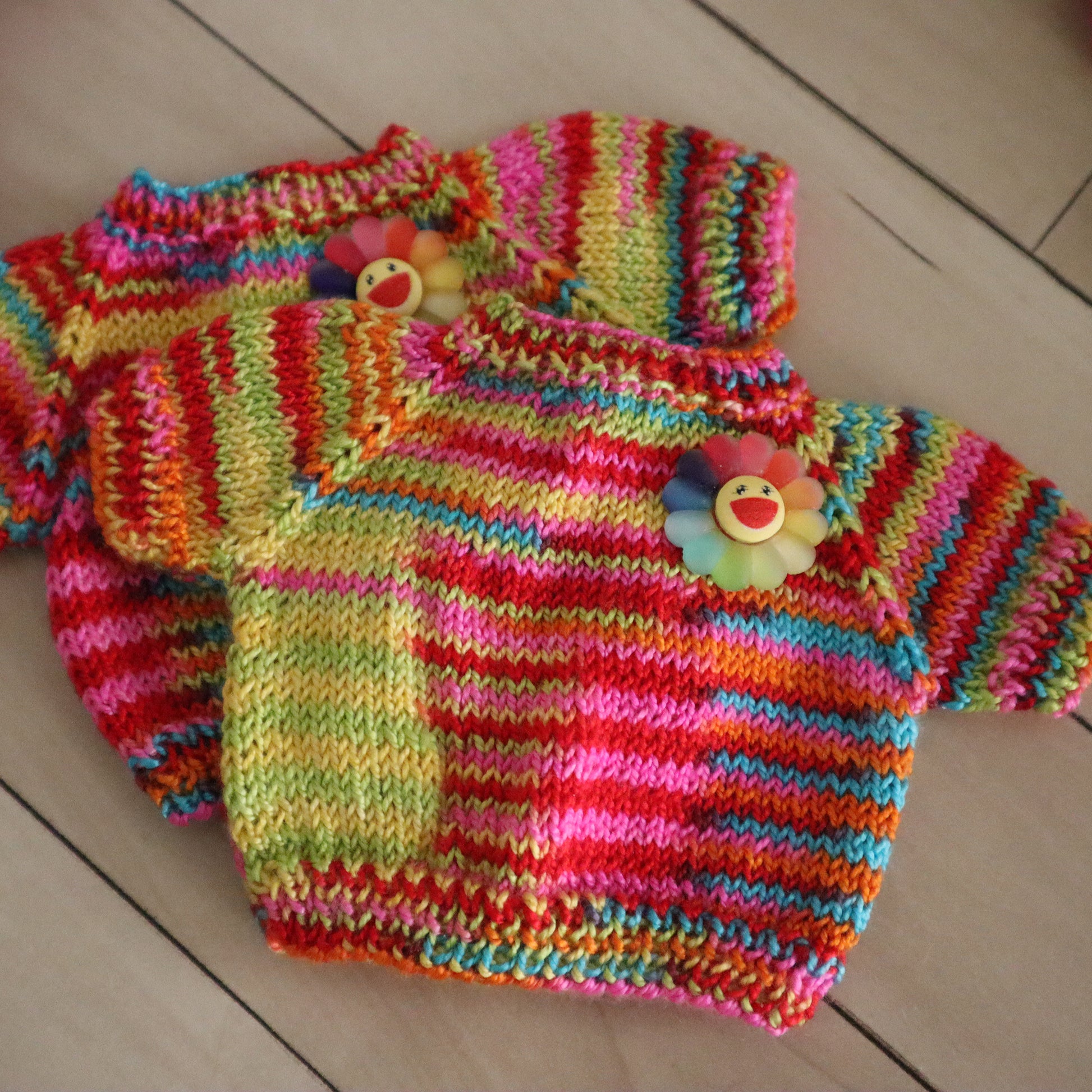 Handknit sweaters for bjds. Rainbow with bonus magnetic brooch. Pale and Dark pink Berry pattern with crocheted blossom decoration. Check below for size and style available.